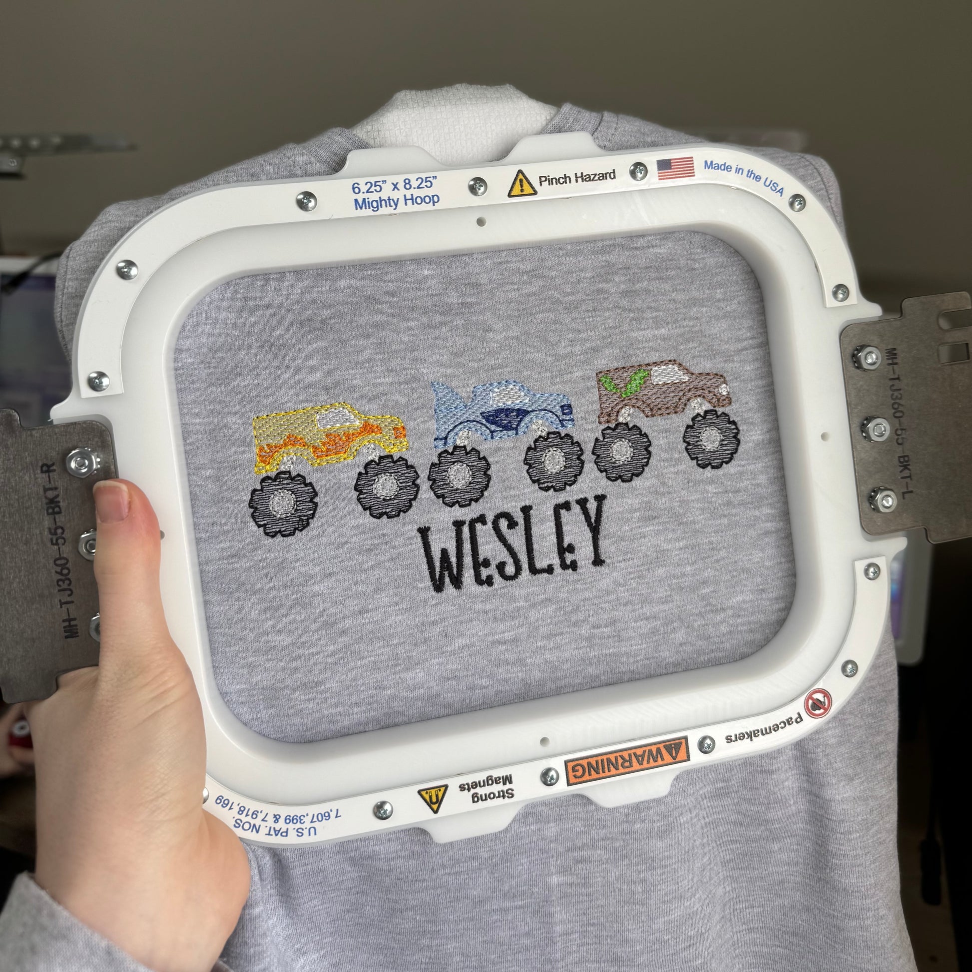Rev up your creativity with this bold and vibrant embroidered Sketch Monster Truck Design! Featuring a trio of monster trucks your kid will love.